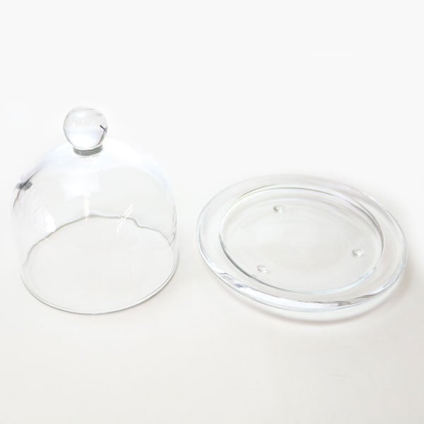 コロンとしたフォルムのガラスドーム&ソーサー。食品だけでなく、お気に入りの時計やアクセサリーのホコリ避けとしても役目を果たしてくれます。