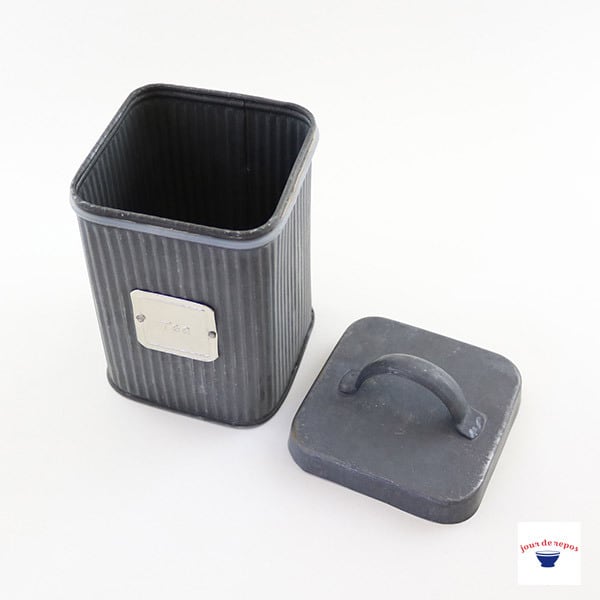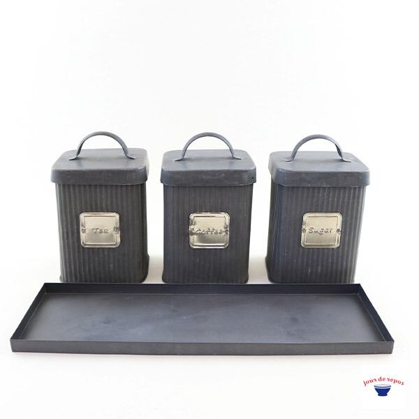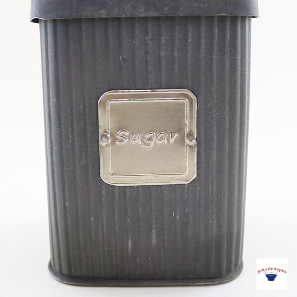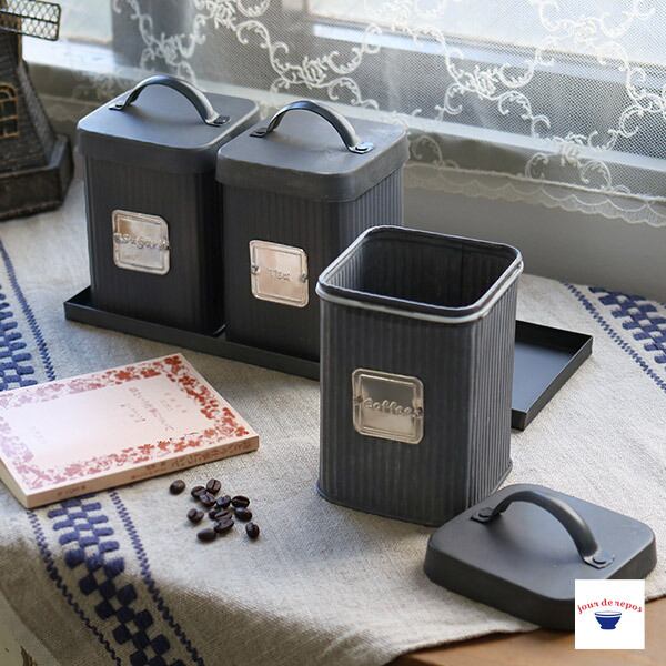 ヴィンテージ風のスクエア型キャニスター。コーヒー、紅茶、砂糖のプレート付きで、無骨な質感がひと味違った空間に早変わりします。