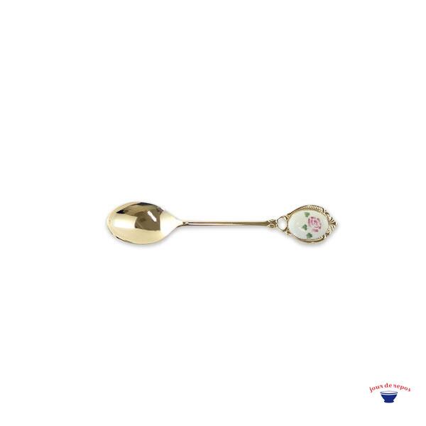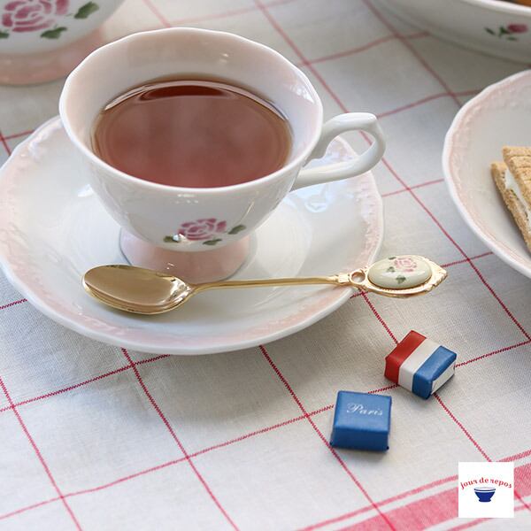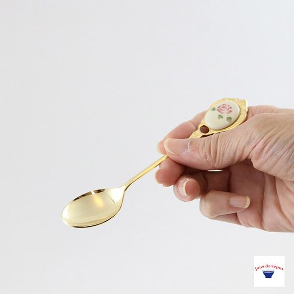 メタルのローズスプーン。華やかなローズ柄が食卓のアクセントになりティータイムを上品に演出してくれそうです。