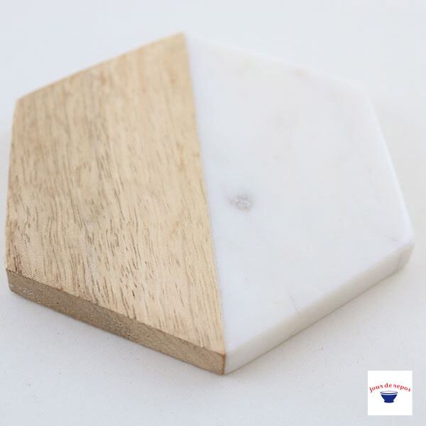 アンティーク風の六角形コースター 。大理石とウッドを組み合わせたモダンな仕上がりになっており、リバーシブルでお使いいただけます。