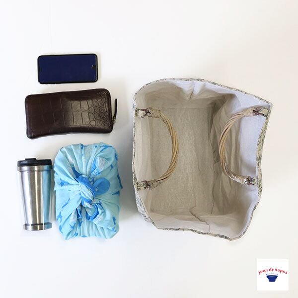 プレートには、LA VIE PIANISSIMO(ゆっくりとした静かな日々)が付き、爽やかなオリジナルファブリックを合わせています。荷物が少ない時は両端を収納でき、2つの形を楽しめる2WAYデザインです。底マチは広いのでランチボックスに水筒、長財布などが収納できます。生地は綿麻なので、程よいシワ感とハリコシのある生地でさらりとした優しい肌触りになります。