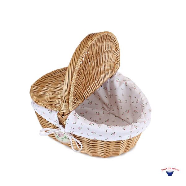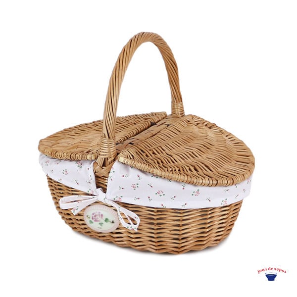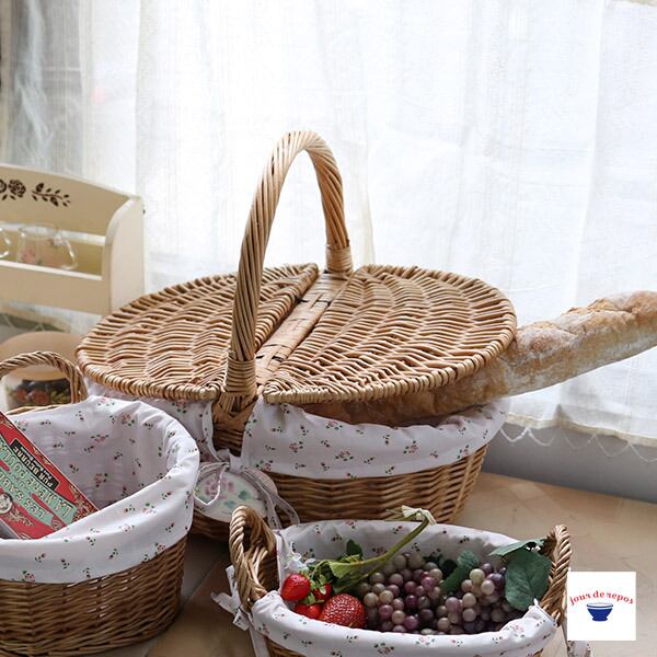 マニーオリジナルファブリックを使用したバスケット。生地は取り外して洗濯ができ、ローズの陶器プレートがアクセントになっています。普段使いからお出掛け、リビングや洗面所などお好きな場所に置いてお使いください。